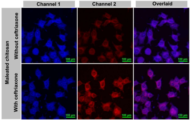 Confocal microscope images of the aggregates dye–poly(hexamethylene guanidine) (PHMG) and dye–ceftriaxone–PHMG encapsulated into different chitosan types endocytosed into cells. Images from left to right show:
