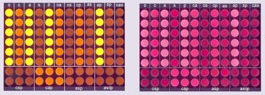 96-well plates with various fluorophores used in the discrimination of model drug mixtures (c, a, s, p = chloramphenicol, amikacin, sulfamethoxazole, pyracetam; o = no analyte) with fluorescein attached to the surface of silica nanoparticles via poly(ethyleneimine) (left plate) and a mixture of 4 fluorophores (right plate). Irradiation by a 254-nm lamp in Camag Visualizer 2, exposure time 10 sec.